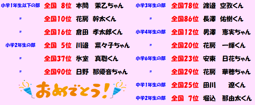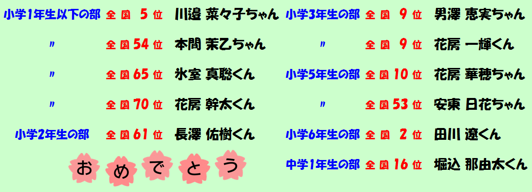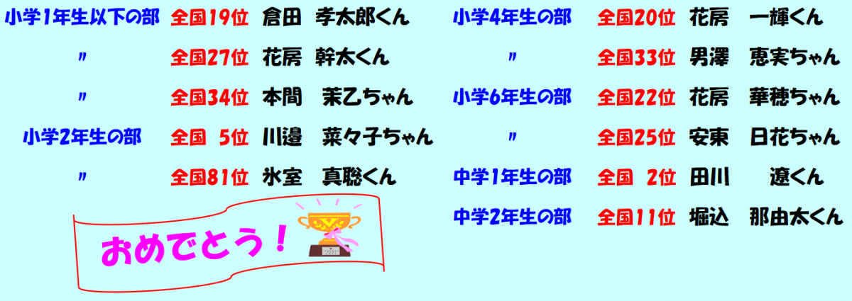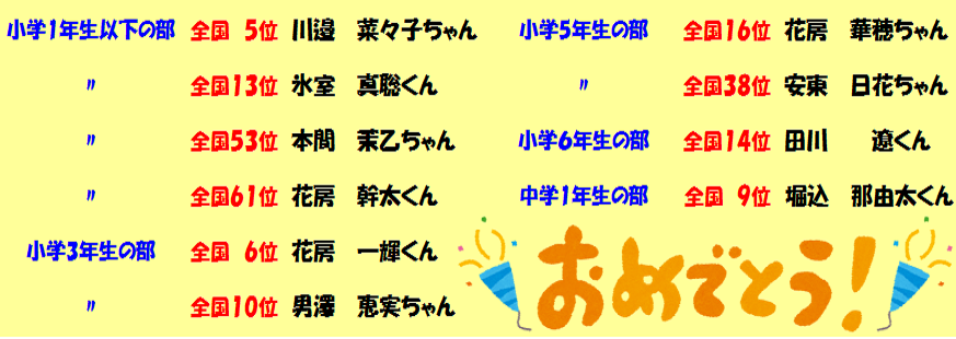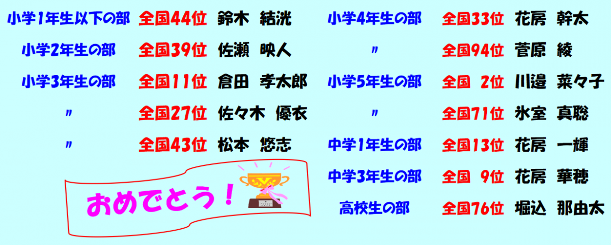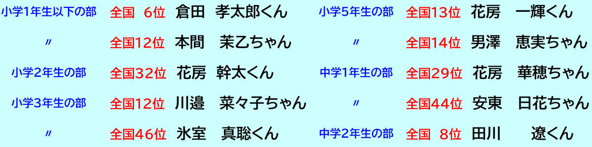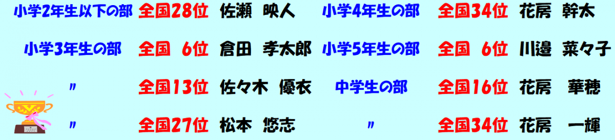 (小学2年生以下の部、3年生の部、5年生の部、6年生の部、中学生の部にて優勝)